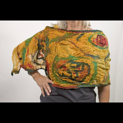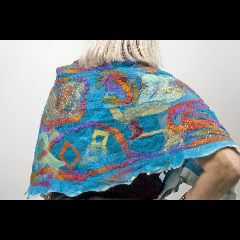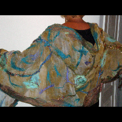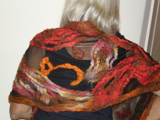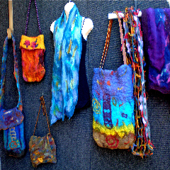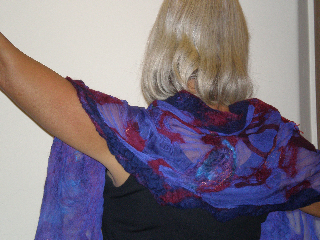 Fiber These photos are nuno-felted shawls, using hand-dyed silk and various wool fibers, embellished with occasional beads and assorted yarns. They are original designs and one-of-a-kind art pieces. They can be featured as examples in the Fiber Gallery. It should be noted to contact me if interested in a similar piece. Dimensions of the shawls vary, designs and colors can be determined by consultation with the artist. Prices vary by size, type of fabric, fiber, and intricacy of design. Scarves generally ranges from $90-$125. Bags range from $40-$350. Shawls, shrugs, and other wearables range from $220-$400.